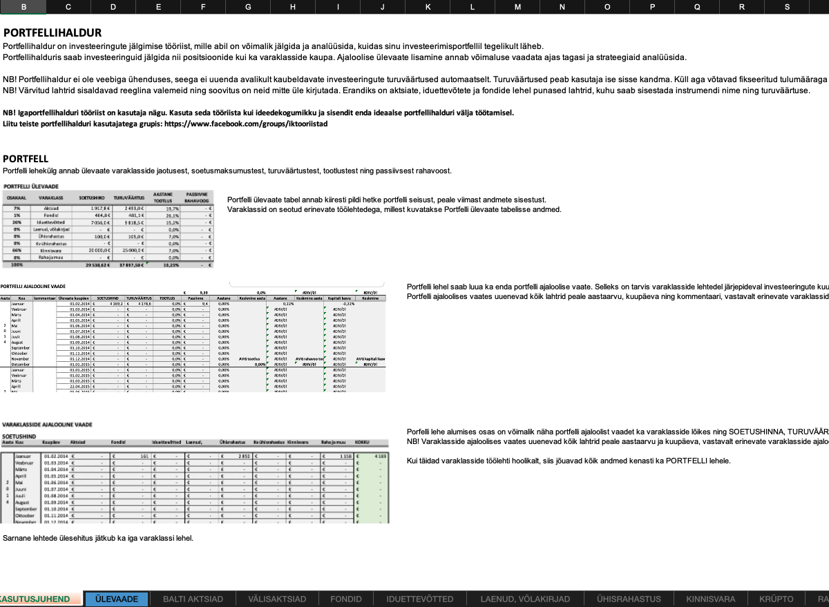 Minu jaoks on olnud portfelli haldamise tööriista ehitamine evolutsioon. Algselt, kui portfelli väärtus oli mõni tuhat eurot, siis oli minu Exceli failis ainult mõned read infot. Mida aeg edasi, seda rohkem tekkis ridu ja seda rohkem tekkis struktuuri. Kümne aasta jooksul on minu portfellihaldur aina arenenud ning täna koosneb see rohkem kui kümnest töölehest, milles igal lehel on täidetud pooltuhat rida. Samas jooksevad igalt töölehelt numbrid kokkuvõtvale lehele kokku ning see annab kohe kiire ülevaate portfelli hetkeseisust.